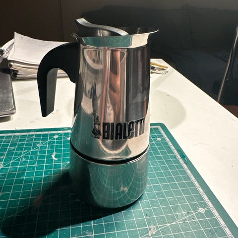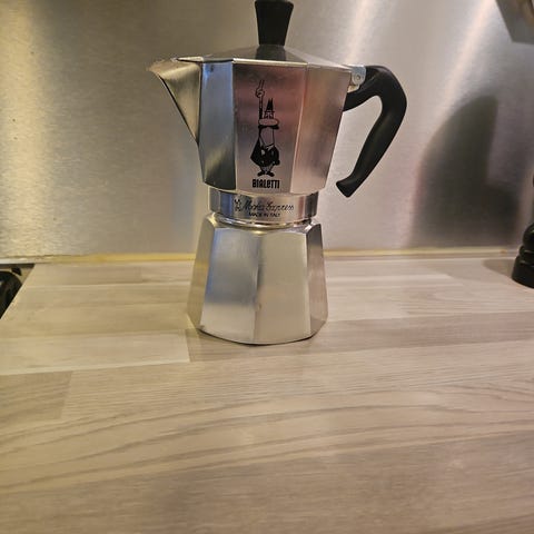 Bialetti Moka Express espressokanne i aluminium med kapasitet på 4 kopper. Kannen har klassisk åttekantet design og svart plastikkhåndtak. Egnet for bruk på komfyr for brygging av espresso.
