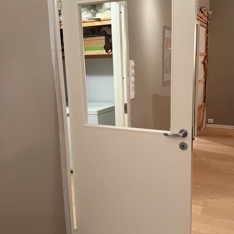 Innerdør i hvit farge med glassfelt delt i seks ruter. Døren har et klassisk design og er utstyrt med kromfarget dørhåndtak. Passer til innvendig bruk i bolig eller kontorlokaler.