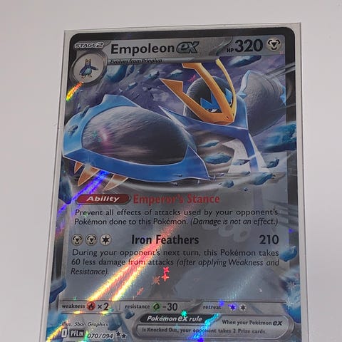 Pokémon Empoleon EX samlekort med angrepet "Iron Feathers" som gjør 210 skade. Kortet har holografisk design og viser karakteren Empoleon i kampstilling.