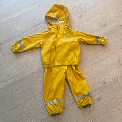 Pent brukt regnsett til barn i størrelse 86. Settet er foret med myk fleece, perfekt for kjølige og våte dager i barnehagen eller på tur. Holder barnet tørt, varmt og komfortabelt.