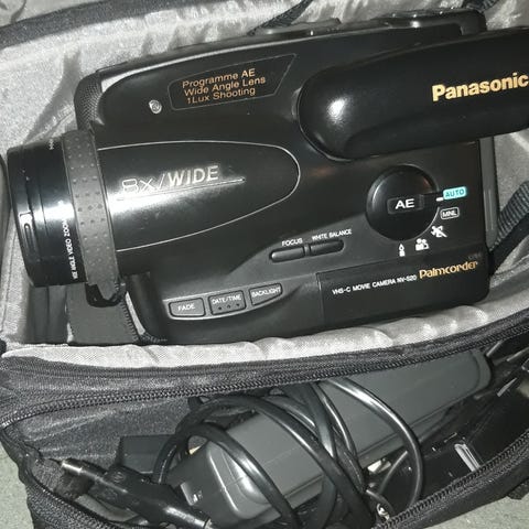 Panasonic NV-DS5 videokamera med innebygd skjerm, fjernkontroll, batterier, lader/strømadapter og tom kassett. Tar opp og spiller av kassetter. Det kommer feilmeldinger av og til. Fantastisk 10x optisk zoom. Basestasjon med koblinger til TV. Kobles til PC med firewire kabel.