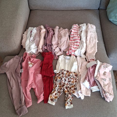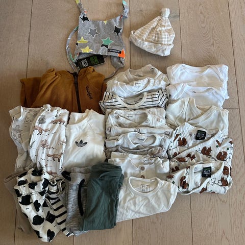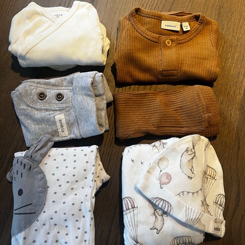 4 ullpysjer med glidelås og tryllefot fra Name It, 2 ullbukser fra Name It (ubrukt), 4 sett med body og bukse fra Helledussen (det brune er ubrukt, det blå med dinosaurer er brukt et par ganger), 4 tynne luer (ubrukte). Den ene pysjen med biler har et par flekker og er litt slitt på et par områder (se bilder). 😅 Alt er kun vasket på skånsomt program med parfymefritt vaskemiddel for ull. Selges samlet.