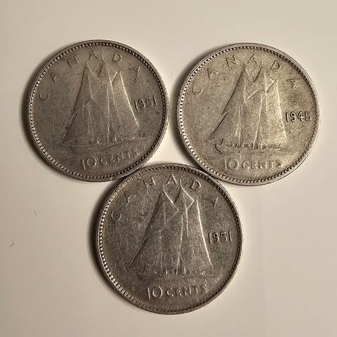 3 stk 10 cent Canada 1953 - 1962 selges 100 stk