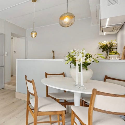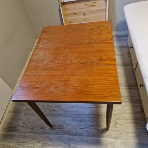 Fine stoler i god stand. Stoff er originalt og helt på alle 6 stoler. Strikkende under var veldig slakke så løste det v å legge inn tynn panel (heltre furu) som gir korrekt fasthet og fjæring + skumgummi på toppen for mykhet. Sittekomfort føles tilnærmet nøyaktig lik som original. Men noe fastere. Dette er utført av møbelsnekker.