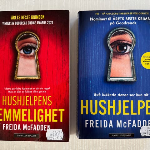 Freida McFadden Hushjelpen krimbok. Boken består av tre titler: Hushjelpen, Hushjelpens hemmelighet og Hushjelpen ser deg. Krimbøkene er skrevet på norsk og tilhører sjangeren psykologisk thriller og spenningslitteratur.