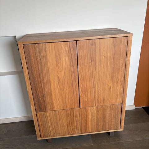 Selger en splitter ny og ferdig- montert japandi høy skjenk fra fagmøbler, denne skjenken er laget av 100% eik, rommer masse i hver hylle og hele skjenken ble også oljet da vi kjøpte den for å bevare fargen og treverket.
