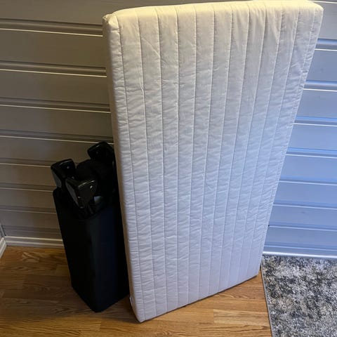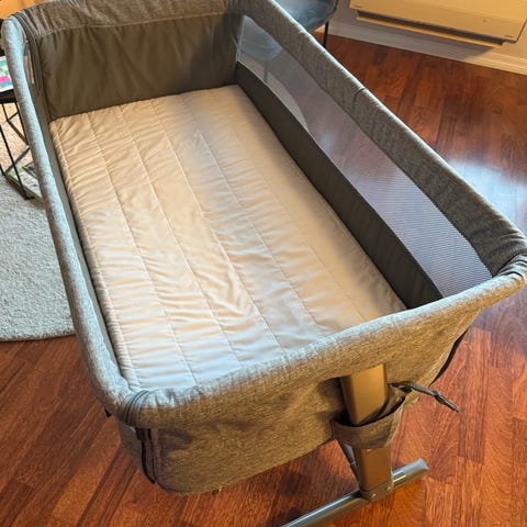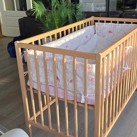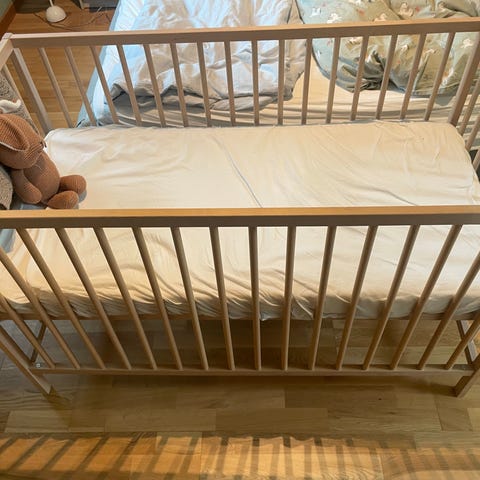 Babyseng som kan brukes både frittstående og som bedside seng. Høyden er justerbar. Sengen er montert på en spesialbygget hylle for å få ytterligere høyde (denne kan skrues av). Pent brukt madrass medfølger.