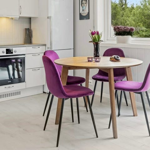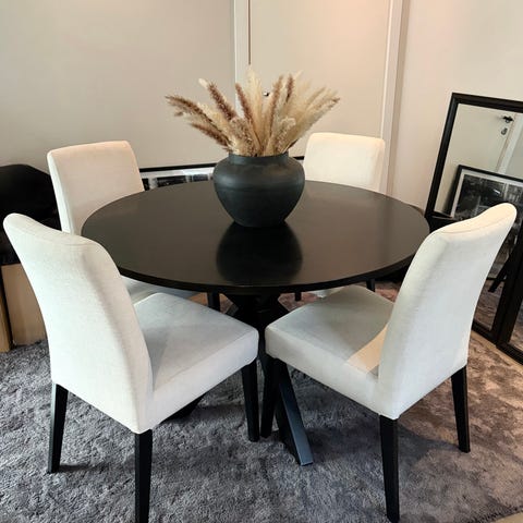 107 cm i diameter, 76 cm høyt hvitt og trefarget spisebord i tre til salgs.