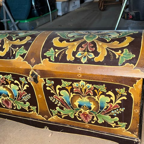 Antikk kiste laget i tre med dekorative utskjæringer på hjørnene og fronten. Kisten har en rund låsemekanisme i midten av frontpanelet. Designet viser klassiske detaljer og en mørk brun finish. Egnet for oppbevaring og dekorativ bruk.etter oppussing, ny maling