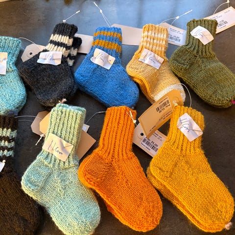 Mange forskjellige sokker til salgs. Mange nye ull sokker, noen brukte ull og vanlige sokker.