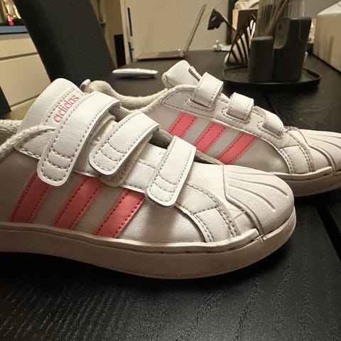Kule originale joggesko med tre svarte striper og borrelås. Pent brukt av ett barn, én sesong, innendørs i hall.