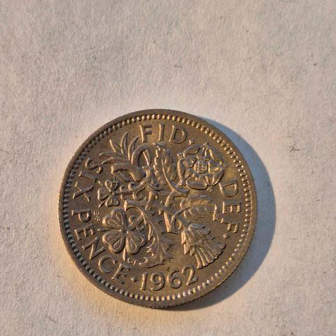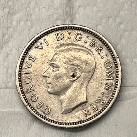 britisk Sixpence-mynt fra 1948 med kong George VIs portrett.