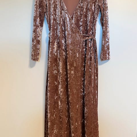 Pent og lite brukt omslagskjole/wrap dress i dus gammelrosa farge. Str S. Myk og god fløyel. Se mine andre annonser.