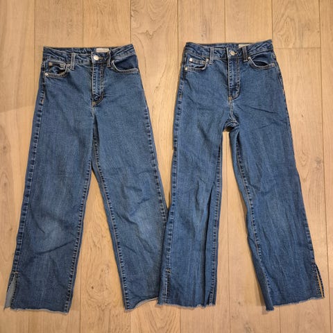KappAhl denim bukser i blå farge, størrelse 152 for jenter. Laget av denim materiale. Bukser med slitte detaljer på knærne. (Skal være slik). Ingen flekker. Som nye. Selges samlet. Prisen er fr begge.