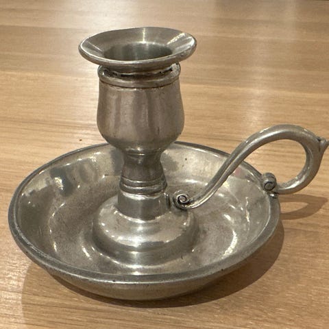Et par lysestaker i tinn, håndlaget i Norge. De passer både til kubbelys og slanke, lange lys. De er 16 cm høye.