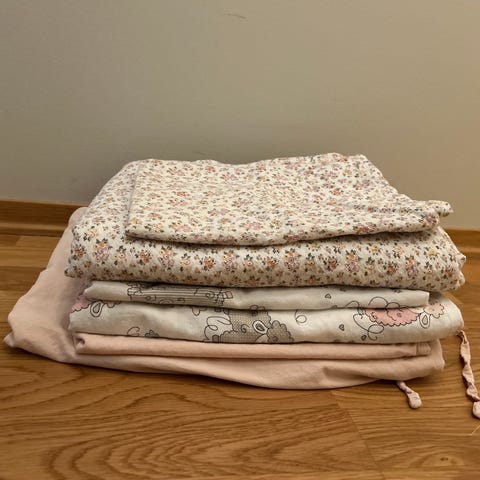 3 pent brukte sengesett. 2 med dynetrekk 100x140 og putetrekk 40x60. 1 med dynetrekk 100x130 og putetrekk 38x55. Det følger med oppbevaringsposer på to av sengesettene.