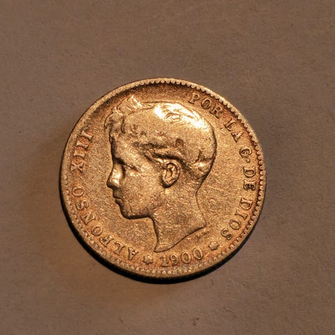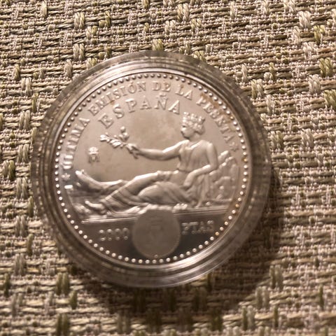 Pen sølvmynt fra Spania. Sølvverdi per 27.12 = 472kr