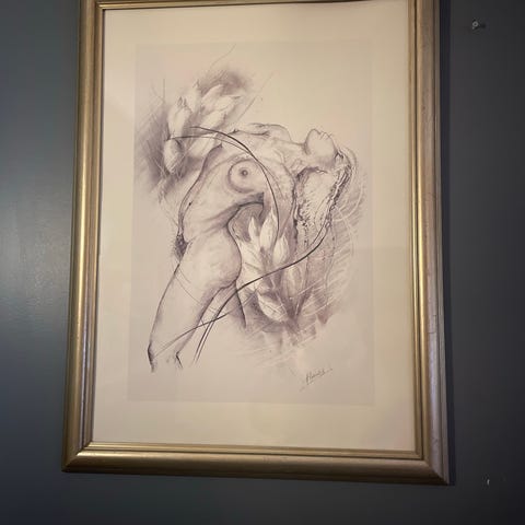 Signert kunsttrykk nummerert 10 av 200 i svart-hvitt. Motiv viser en figur i abstrakt stil. Ramme i metallfarge med glass.
