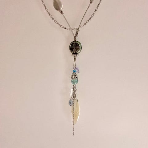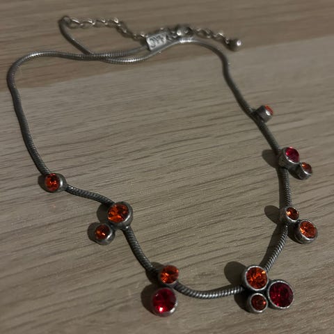 Vurderer å selge dette vakre halskjedet med tilhørende øredobber. Mørknet sølvfarget metall, som har blitt lite påvirket av tiden sammenlignet med de andre pilgrim smykkene jeg har. Noen steiner har gått av, så se gjerne nøye gjennom bildene før du eventuelt kjøper😊