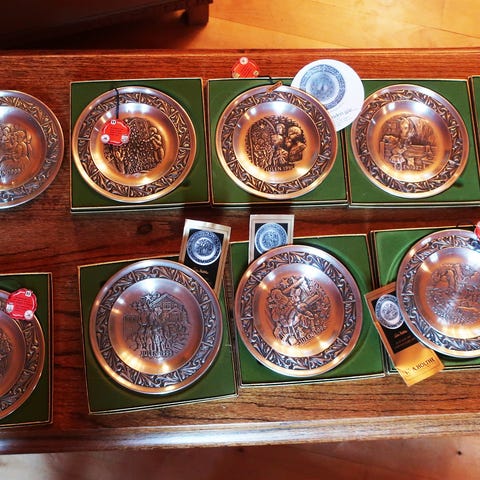 Selger en pen, eldre juleplatte fra 1985 ("Julen 1985") i norsk tinn, designet av Astri Holthe. Motiv av julebakst. Diameter ca. 18,5 cm.