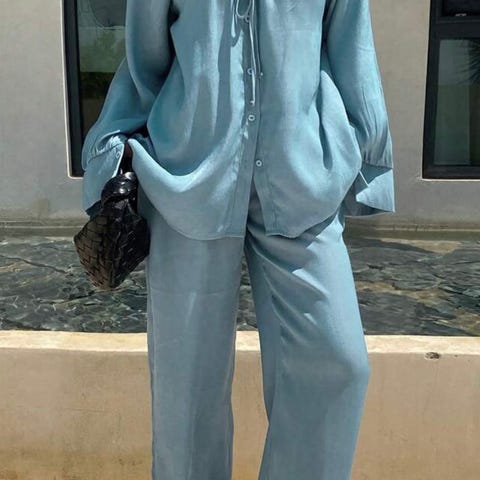 Komfortabelt blått og hvitt stripete sett, perfekt som lounge- eller hjemmeantrekk. Mykt og lett stoff som føles behagelig hele dagen. Overdel og bukse følger med. Str. Xs. Pent brukt, ingen skader.