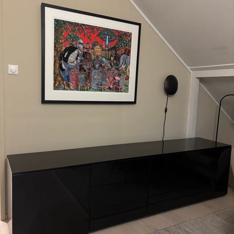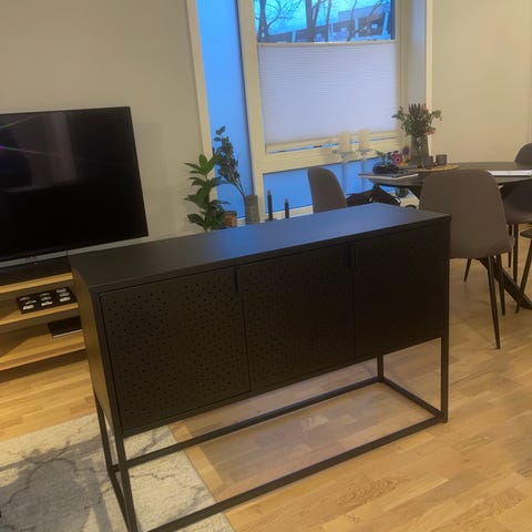 Selger et Vega vitrineskap i god stand. Det er et praktisk mindre skap som har god oppbevaringsplass. Dørene har freste spor og små knotter til håndtak. Følger også lave bein om ønskelig. Det kan da benyttes som tv benk.