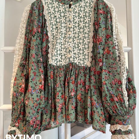 Selger en pent brukt blise fra merket byTimo. Modellen heter byTimo Décorated Poplin Blouse i fargen Off White Bouquet.