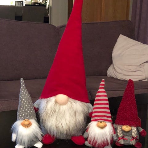 Jul dekorasjonstomter i rød farge. Passer til juledekorasjon og kan brukes som bord- eller gulvpynt i hjemmet.