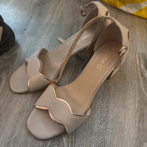 & Other Stories Hæler i størrelse 39. Skoene har en kombinasjon av rød og gul farge med stroppdetaljer. Materialet ser ut til å være semsket skinn eller lignende. Passer for dame.