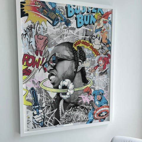 Det er et fototrykk som viser en kvinne med eksotisk kroppsmaling og klær, omgitt av elementer som en flamingo, sommerfugler og en annen person med hodeplagg.