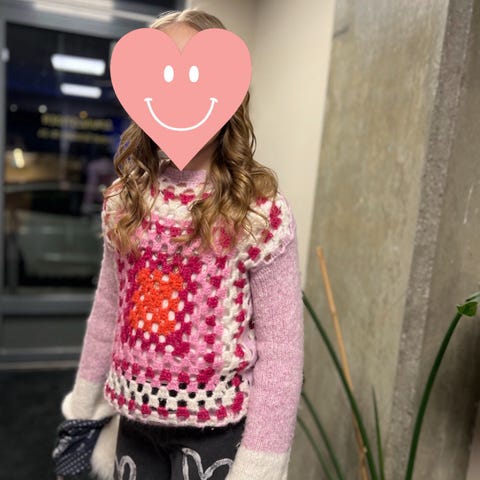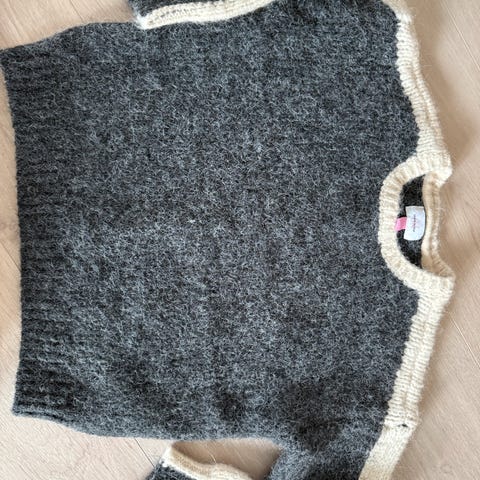Flott hjemmestrikket genser i str 146/152 i svart og blått selges. Kun brukt så vidt en gang.