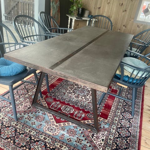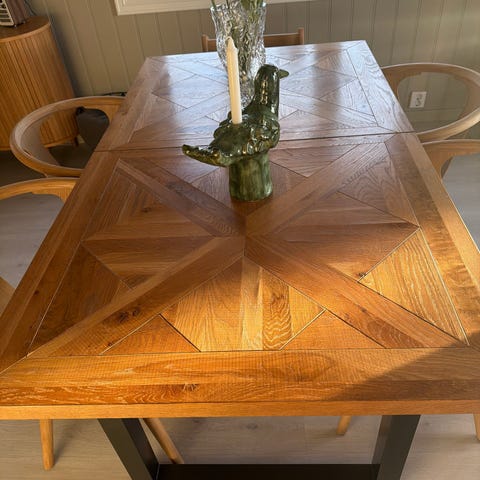 Her er det mulig å få en spennende komplett spisestue, bestående av spisebord med 6 stoler, kommode, høyskap, skjenk, bokhylle med skap.