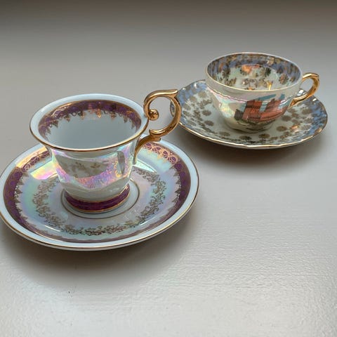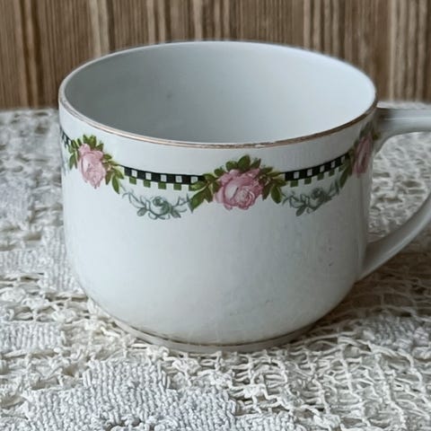 Porcelæn kop med håndmalt dekor og gullhåndtak