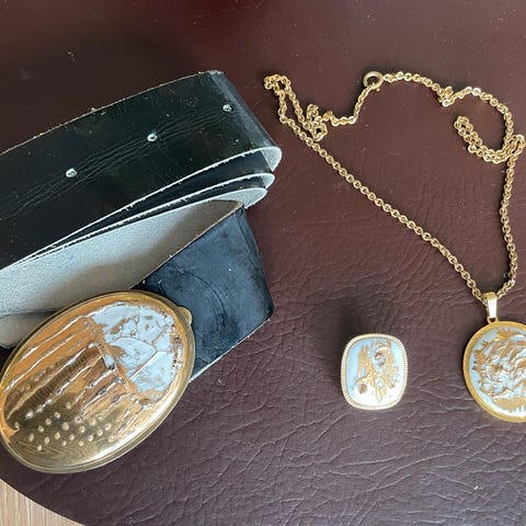 Smykkesett anheng og øredobber håndmalt av Unn Indrelid fra 5875 Årdalstangen. I orginal eske. Malt med gulldetaljer og anheng er signert på baksiden. Settet er ubrukt.