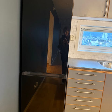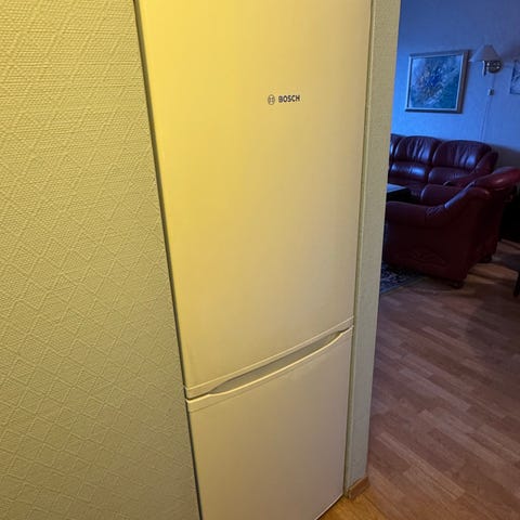 Bosch kombiskap med kjøleskap og fryser i ett. Kjøleskapet har flere hyller og dørhyller for oppbevaring av matvarer, samt skuffer i frysedelen. Skapet har en rustfri finish og er veldig fint og ordentlig tatt vare på.