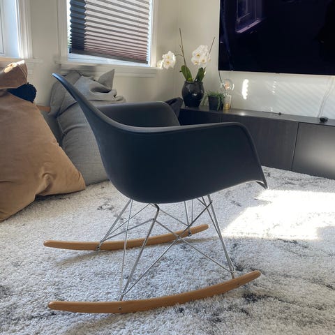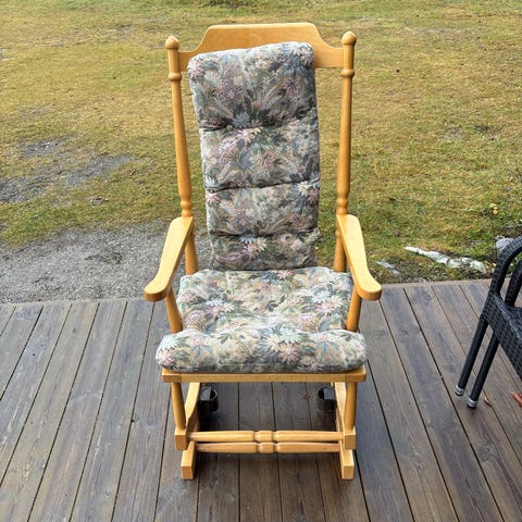 Komfortabel gyngestol i blå tekstil med god sittekomfort og myk gyng. Moderne form som passer fint i stue, lesekrok eller på hytte. Understell i sort metall med tremeier.