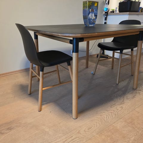 Valencia spisebord 120x 110/350cm sort under, brent eik over. Nypris kr. 17 995,- Selges nå for kr 5 000,- Veldig fleksibelt bort. Godt, men pent brukt. Mye bruk igjen.