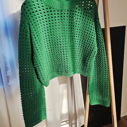 Trendy og luftig strikkegenser fra H&M med åpen/heklet struktur. Kortere modell med lange ermer og rund hals. Perfekt til vår og sommer – fin over singlet, topp eller kjole.
