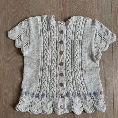 Nydelig strikkesett med tradisjonelt mønster strikket av min mor da vi var små. Jakke, lue og leggvarmere. Litt usikker på størrelsen, men det er rundt 146-152-158. Lua er stor og leggvarmerene litt vide (vi brukte dem utenpå buksa før i tiden).