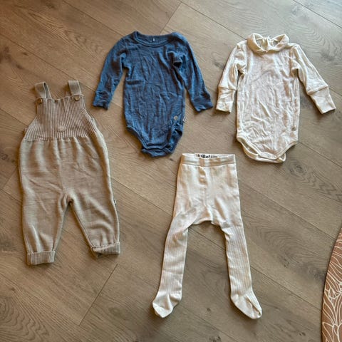 Polarn O. Pyret barneklær i størrelse 74, flerfarget, egnet for både gutter og jenter. Inneholder flere plagg med ulike mønstre og farger.