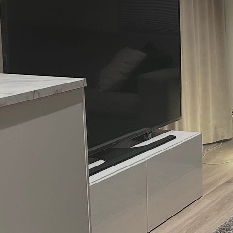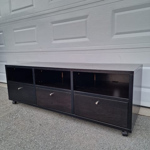 TV-benk. Litt bruksmerker. Den ene hengselen til den ene døra er løs. Kan fikses med lim, sagflis og nye skruer.