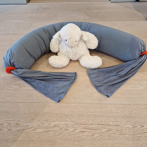 Pent brukt gravidpute / ammepute med medfølgende trekk, fester og pose. Trekk er vasket og klar for bruk. Det er også mulig å få tak i egne trekk separat om man vil byte farge.