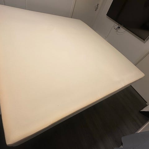 Rammemadrass 90 x 200 cm med Wellpur overmadrass + bein i bøk. Rammemadrassen var ny i oktober 2025 og har blitt brukt noen få netter, overmadrassen er brukt av og til fra 2024.