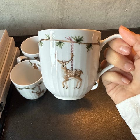 Kähler julekrus med julemotiv, laget av porselen. Kruset har dekorative motiver som inkluderer julepynt, musikkinstrumenter og reinsdyr.