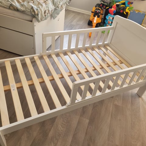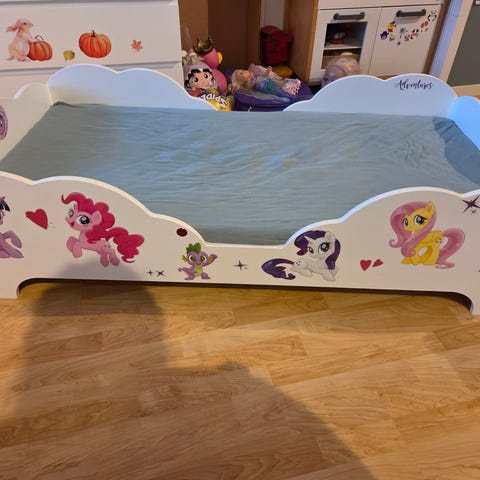 JLY Juniorseng for barn med grå farge. Passer for barn som vokser ut av sprinkelseng, og gir en trygg overgang til større seng. Det følger med en oppbevaringsskuff til å ha under sengen. Madrass følger ikke med.
