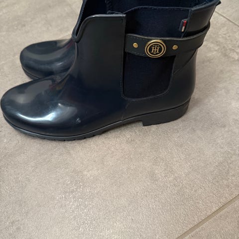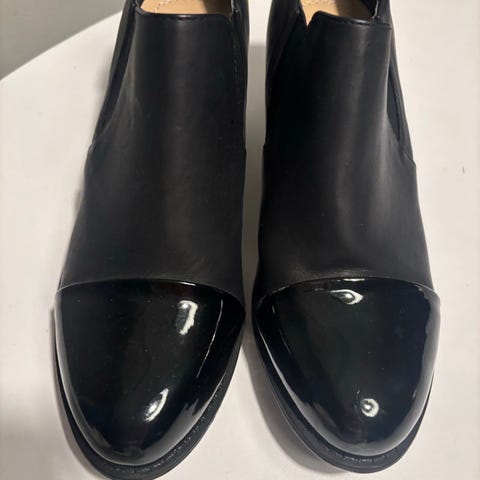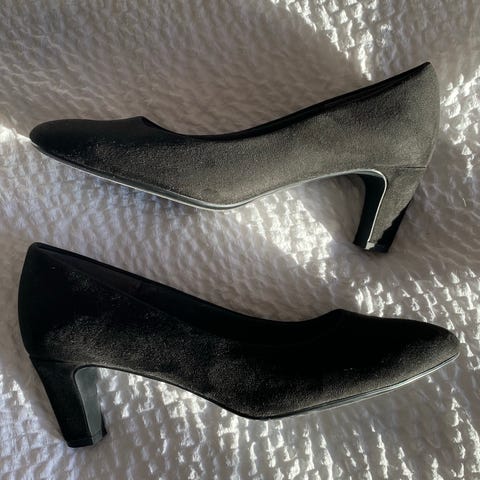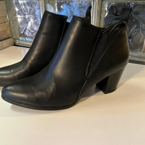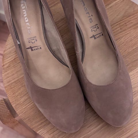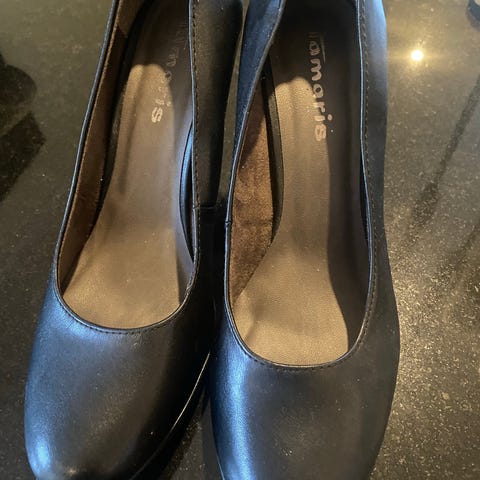 Tamaris hæler i størrelse 41. Skoene er svarte og laget av semsket materiale. De har en glidelås på innsiden for enkel på- og avkledning.