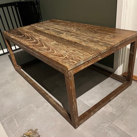 Svært flott bord for stue selges. Stålrammen er helt strøken og topplaten har litt riper og merker etter barnesikring på hjørnene. 1 strøk eller 2 med maling så er det tipp topp igjen.