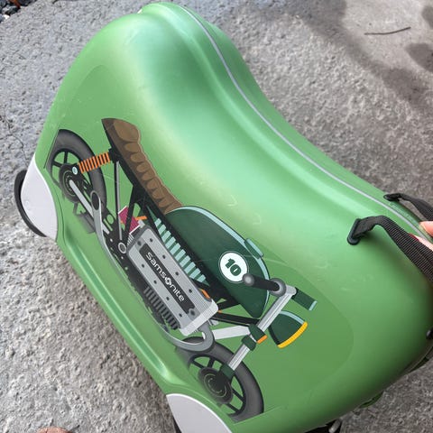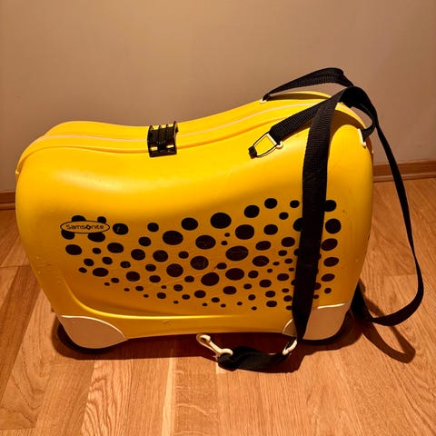 Koffert fra Samsonite sin Dream2Go-serie. Går som håndbagasje på flyet. Barnet kan sitte på kofferten og bli dratt av en voksen på flyplassen. Kjempegøy for slitne ben! Brukt av et barn fra alder 2 til 5 år.