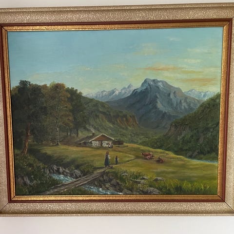 Maleri som viser et landskap med en elv, hus og fjell i bakgrunnen. Maleriet er innrammet i en dekorativ, antikk ramme. Lerretet har synlige sprekker og tegn på aldring, som vist på bildene.