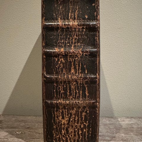 Noe slitasje perm, enkelte små rifter. Nokså rene og pene sider. Ca 23,3 cm høy.